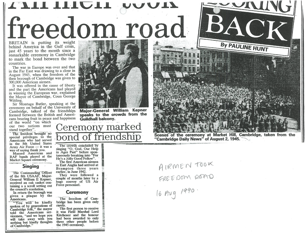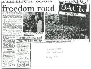 30/9/1946 The Honorary Freedom of the Borough was bestowed on the Cambridgeshire Regiment in recognition of its service in the South African War, for its superb professionalism during the fighting in Flanders and for its valiant fight in the Far East. That fight had not ended with the last shots fired in the defence of Singapore – in fact the courage that was now being recognised was the 3 and a half years of captivity that followed. In prison camps scattered all over the Far East they had suffered every hardship, lack of food, disease, cruelty, indignities and utter isolation. Among many ordeals the building of the railway in the grim jungles of Siam was singled out by the Mayor for especial mention. The full extent of their sufferings was being to be revealed. Padre J.N. Duckworth told the inspiring spirit and morale under the most terrible conditions. In August 1944 he had been in the “valley of the shadow of death”, 450 miles long through which they were constructing the Burma- Thailand railway, his audience were horrified to hear of the conditions and of the state of the men suffering ulcers, malaria, beri beri and dysentery. It had been August 13th 1945 when his particular camp had heard on their small Japanese radio of the atom bomb dropped on Hiroshima, four days later it was over – “there was no flag waving or anything like that, just a long sigh of relief”. Now there was flag waving – and a particular flag had place of honour from the Guildhall flagpole – the blue flag of the 1st Battalion of the Cambridgeshire Regiment that had somehow been kept hidden from their captives during the long years of captivity. As the procession wended its way down Petty Cury it was the drums that marked their progress. And amongst the drums were some emblazoned with the Regiment’s honours won in earlier wars but lost in the fall of Singapore. Amazingly they had been found by a Dullingham girl, Mary Taylor during her work with the Red Cross and shipped back to Cambridge. In October 1946 they led the old men of the First War and prematurely old boys from the Second to the Guildhall to receive the Freedom they had fought to preserve. (Cam.News)