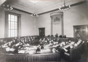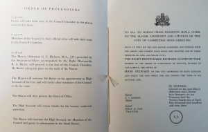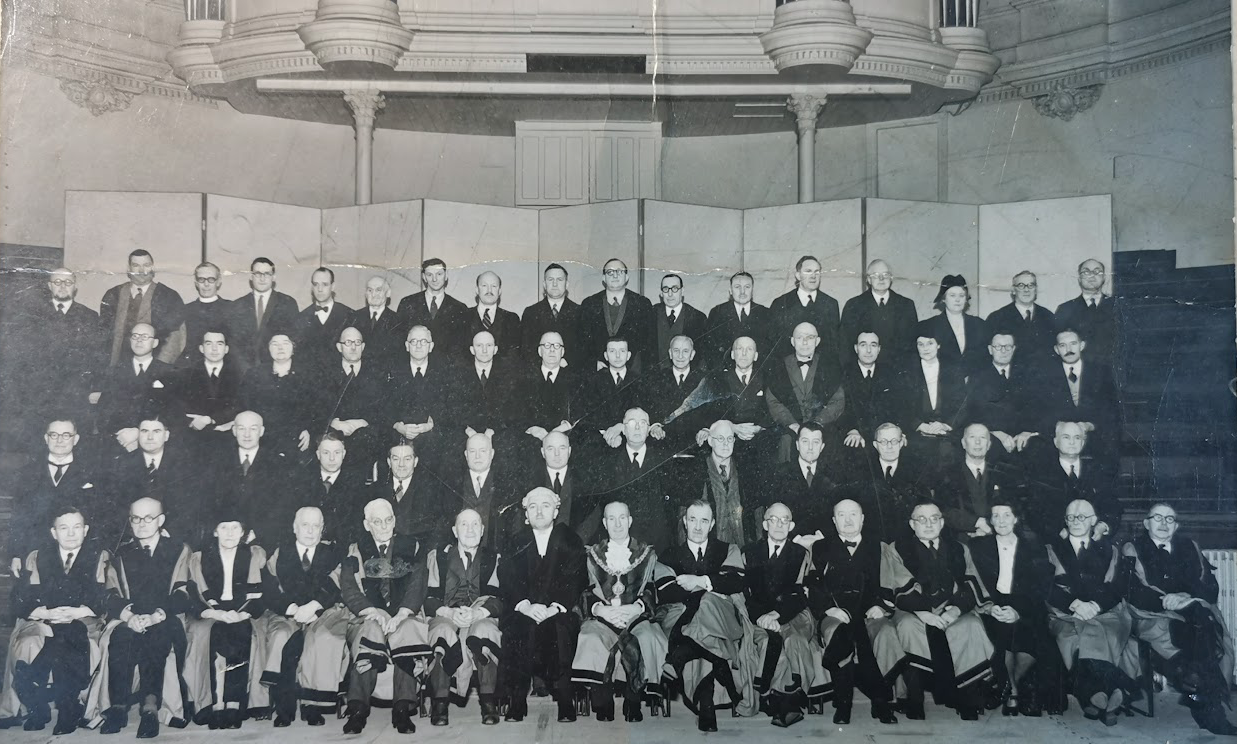 7/1/1938 The demolition of parts of the old Guildhall has meant that several annual functions have lost their normal home. But a Mayoral reception elsewhere than in the Guildhall must surely be unique in Cambridge history. It is symbolic of the happy relations existing between the Town and the University that the Old Schools should have been placed at the disposal of the councillors. Cars containing guests pulled up on King’s Parade and a lengthy walk under illuminated awnings led to the Dome Room. The Council Room, East Room, Syndicate Room and Regent House were in use but only the dais where the orchestra played for dancing was decorated (Cam.News)