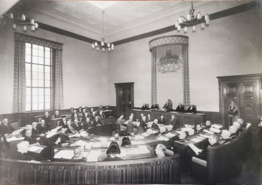 28/7/1939 Cambridge Town council held its last meeting at Shire Hall while the Guildhall was reconstructed.The Library committee asked to use the Small Room as temporary reading room during the rearrangement of the Central Library. But it had a very expensive carpet that might get spoilt. The library might use the Corn Exchange annexe if the cycles were moved. Aid Briggs said that was not a proper alternative: “The fact is that we have had made a beautiful Guildhall, but must not use it”. The carpet could be taken up. But the Guildhall might not be finished by that time and it would be unfortunate if people were allowed in the Small Room before the rest were completed. The request was denied (Cam.News)