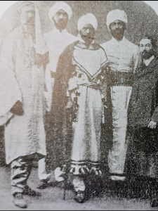 1905, Sultan of Zanzibar hoax: from left, Adrian Stephen, Bowen Colthurst, Horace Cole, Leland Buxton and “Drummer” Howard.