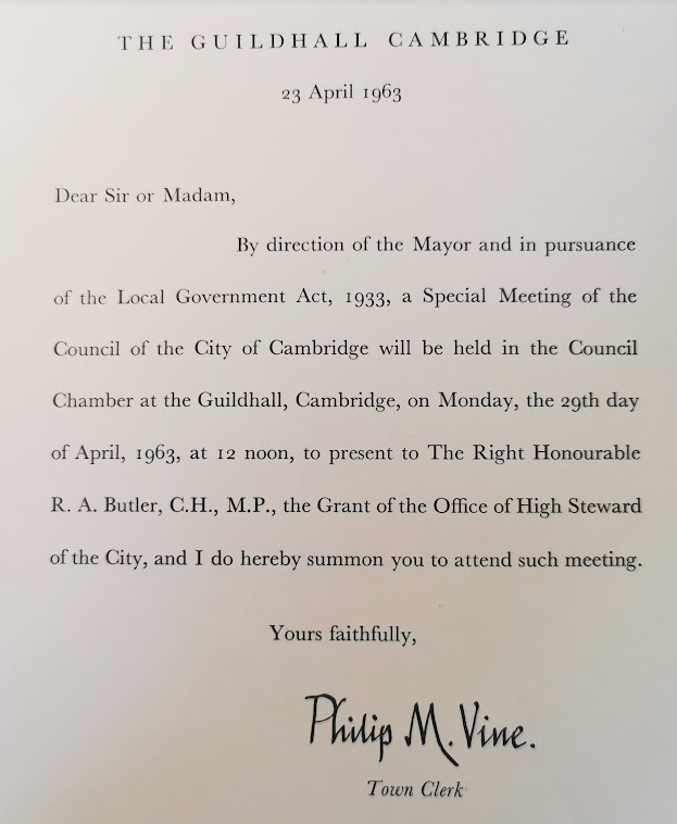 22/7/1939 The new Cambridge Guildhall will be opened on October 9 th by the Earl of Derby. The grand staircase is much more imposing than the old one, the new small room, complete with carpet, will be very convenient and the large hall improved though it is not nearly large enough for conferences, political mass meetings or big musical enterprises. The new Council chamber also seems on the small side and the aldermanic bench has been considerably shortened. (Cam.News)