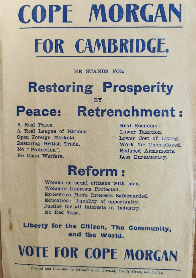 1923 Sydney Cope Morgan was the unsuccessful Liberal candidate for Cambridge in the general election.