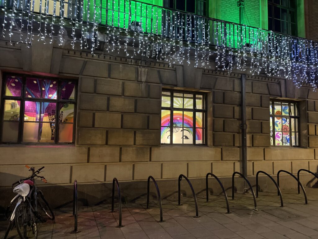 Windows decorated by Oblique Arts. Photos by Lewis Anderson.The Guildhall in Cambridge, also known as the Town Hall, stands on a site on Market Hill long associated with civic government and medieval Jewish history.