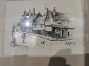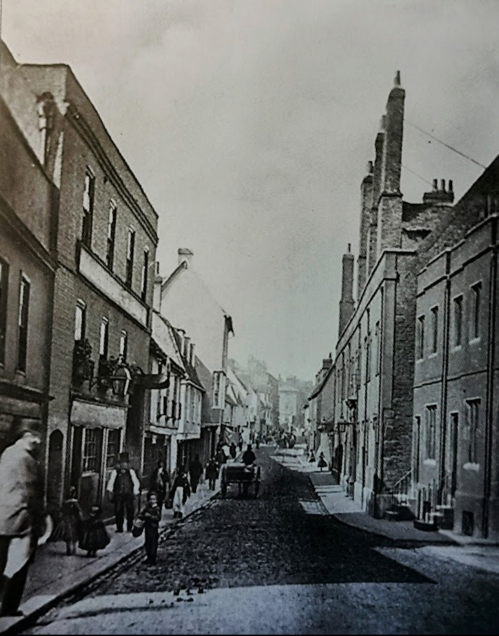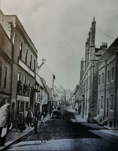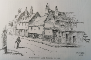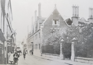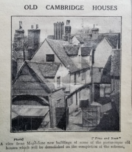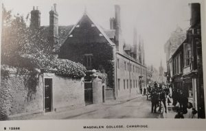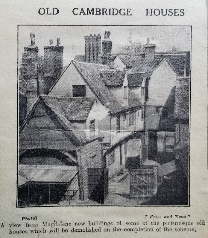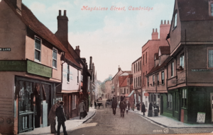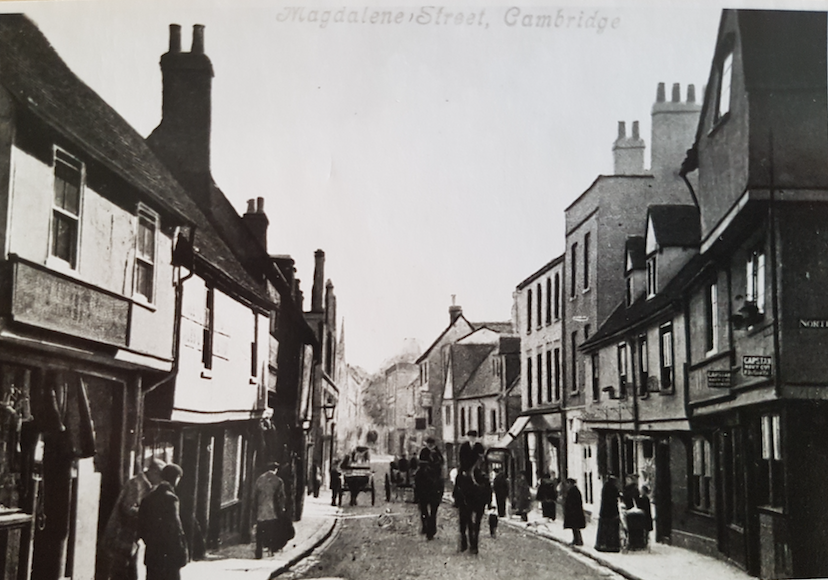 Magdalene Street before redevelopment early 20thCThis view along Magdalene Street from the Castle Hill end shows the east side of the street before redevelopment by Magdalene College in the 20th century. According to 1959 Royal Commission on Historical Monuments Survey of Cambridge: Monuments (201-211) form a notable row of plastered timber-framed town houses dating from late medieval times to the 18th century and, except for later windows almost throughout, comparatively little altered structurally. It is the only frontage of its age surviving in the city of sufficient length to give any impression of the earlier street scene. The houses belong to, or are being bought by, Magdalene College mainly for further accommodation for undergraduates. The alterations are now being made (1955-7). The aspect to the street is being retained but most of the W extensions, of various dates, are being demolished, except the notable W range of Monument (205) [house no.25]