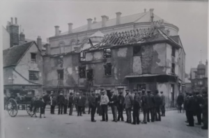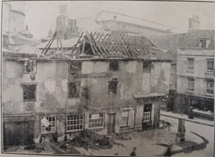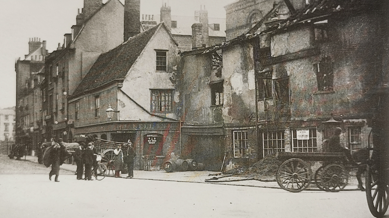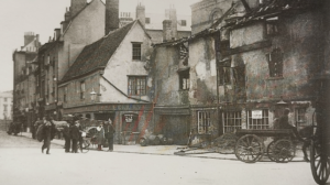 Peas Hill 1904, premises of E Bell and Son, damaged and demolished in 1904 (Cambridgeshire Collection)