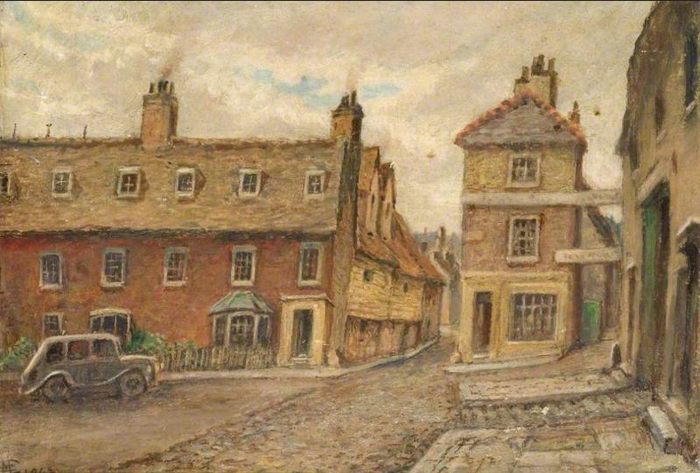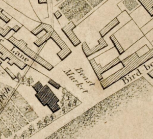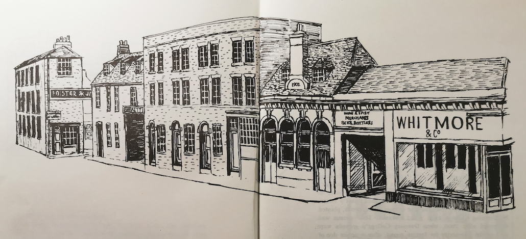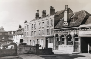 On the corner is “the Bun Shop”, dated on the chimney. Next is an early 19th century terrace of four houses, of special interest because of the original shop front in one. All four were ‘listed’ historic buildings.These were the best dwelling-houses to be built on St Andrew’s Hill. …. The houses looked west over the beautiful University Botanic gardens, to the south was the large Swinecroft Common. On the hill itself the the beast market was held – its ancient name was ‘Hog Hill.’….. But in the early 19th century the two sided ‘square’ began to go downhill. In the 1820s the Parish Workhouse was built, the long range with the Foister’s sign.