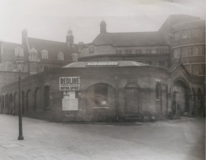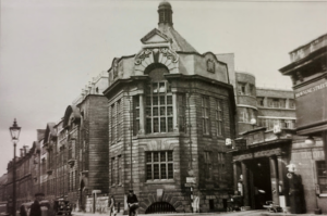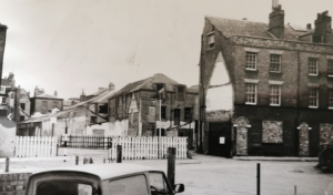 The Corn Exchange was in use for 34 years when a much larger one was built behind the Guildhall. It then became a small shopping centre of 20 shops. In 1894 the shops were forced to close by a ‘Depression. For two years it was a theatre, then from 1896 to 1914 it was a bicycle shop. After WWI it became a garage, as shown in the photo, until its destruction in 1961 for a Police Car park.