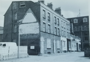 Houses, nos. 9 and 10, on the corner of Tibb’s Row and extending towards Corn Exchange Street …. the plan suggests a 16th-century origin. the earliest of the additions to the W is of c. 1700. The wing, probably once a separate building, is of the 17th century. The whole was remodelled and the main range refronted early in the 19th century, probably by Charles Humfrey and in 1818 when the ownership of the land on which two porches were being built was in dispute. Humfrey evidently established his right, for the porches survive and the space between them is enclosed by railings.