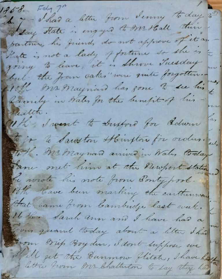 William Farrington’s diary covers the years 1858 to 1862. He writes about everyday life in the Whittlesford/Duxford area of southern Cambridgeshire but his circle of acquaintances covers a large area from his own family in Buckden, to colleagues and friends in Cambridge and beyond. Travel is made easier because of the railways. We hear about romances, illness, crime, insanity and death. By the end of 1860 William is about to get married and move to Duxford to set up his own business. He obviously finds it hard to keep up his diary and this comes to an end in 1862.