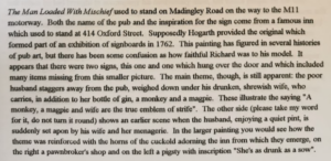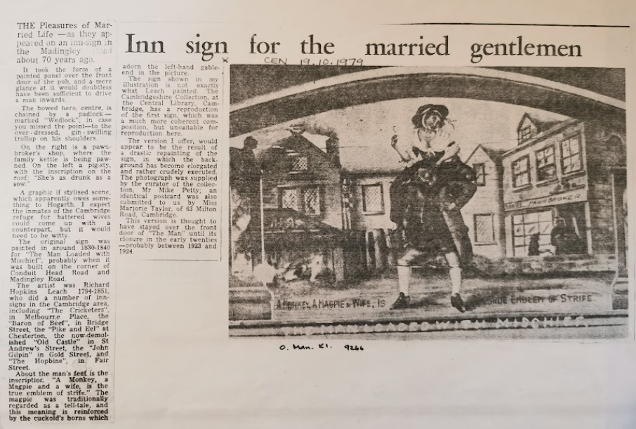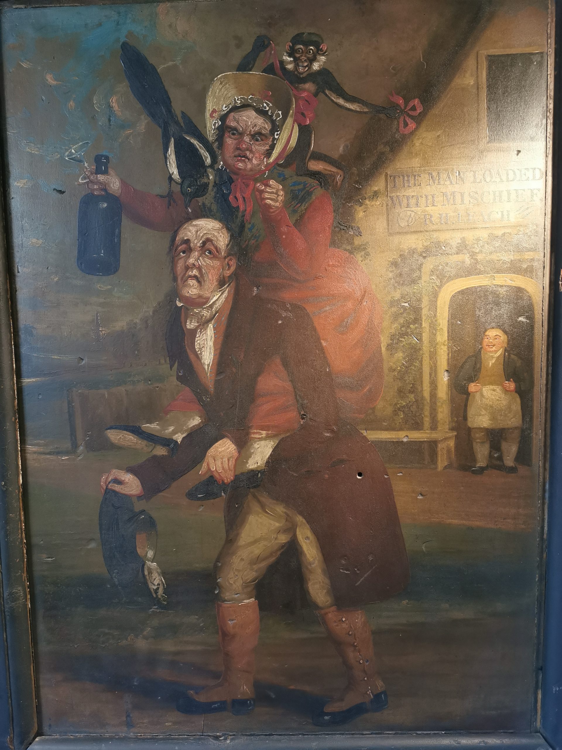 The Man Loaded with MischiefAn original sign for this pub is in the Cambridge Folk Museum. It was painted by Richard Hopkins Leach (29 Maids Causeway). The reverse of the sign shows an earlier scene where the husband, enjoying a pint, is set upon by his wife and animals.