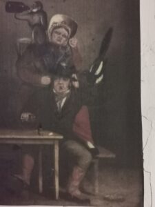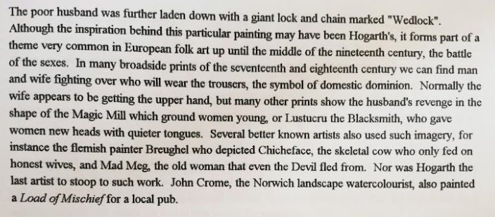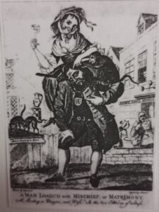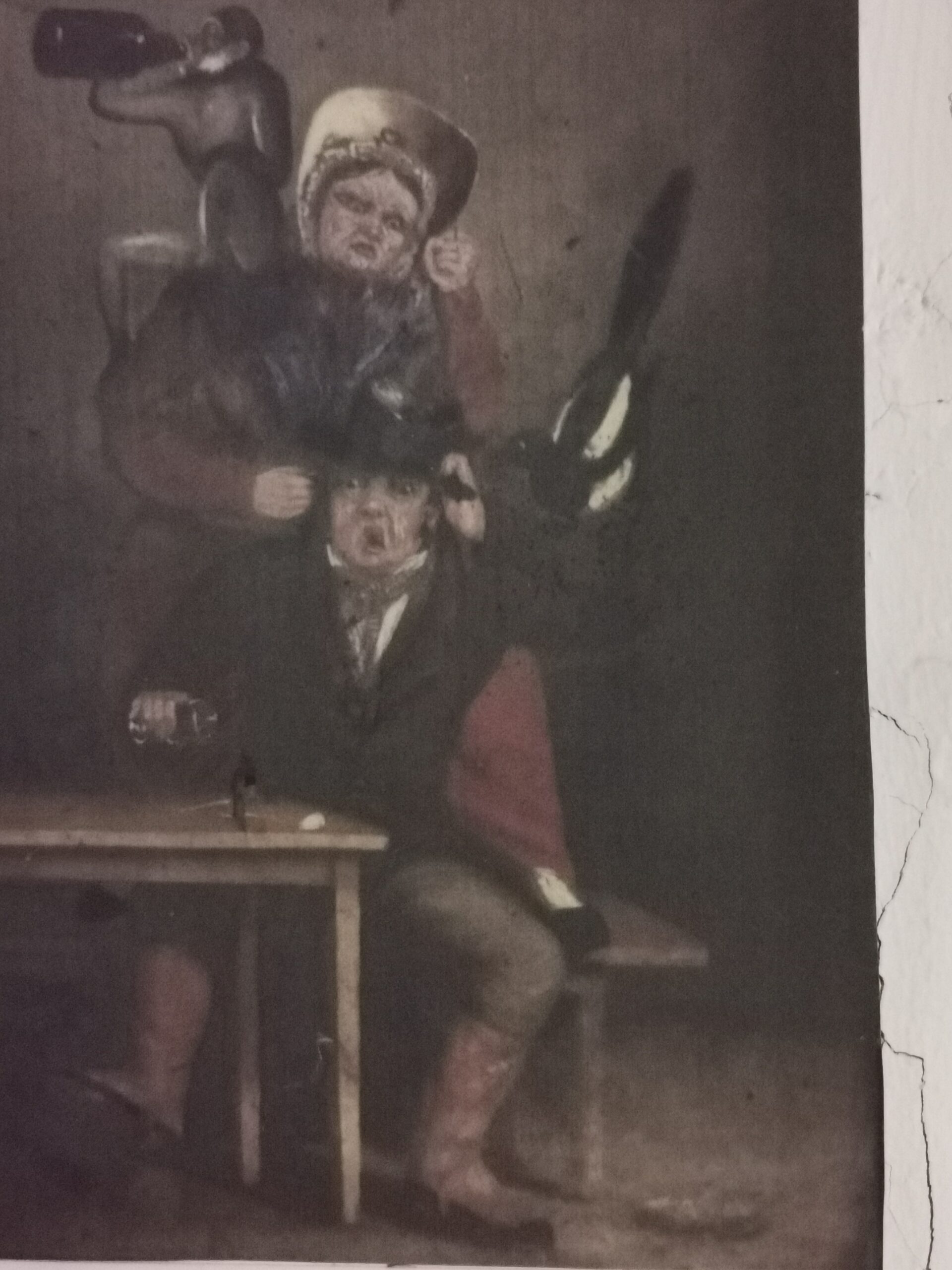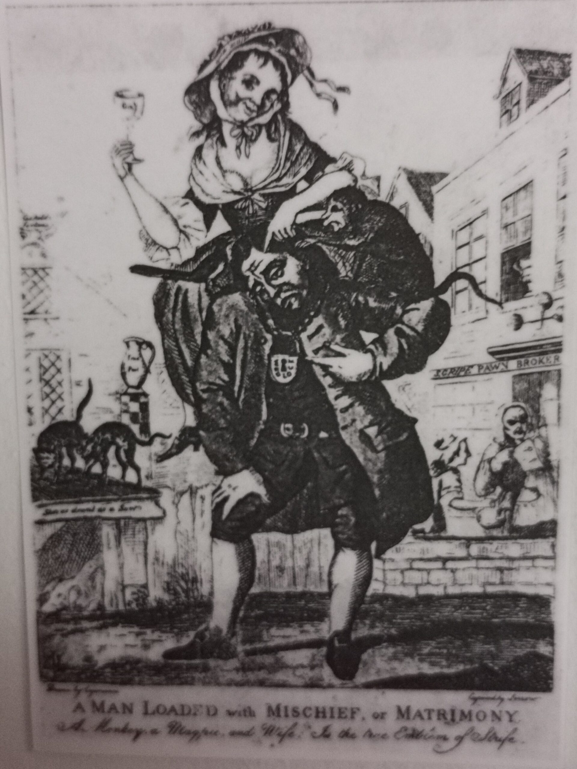 The inspiration for the sign is thought to have been taken from Hogarth, who painted a similar sign in the early 1800s. It hung outside an inn on Oxford Street in London and shows a man leaving a public house called ‘The Cuckold’s Fortune.’ The man is weighed down by his gin-drinking wife, a monkey, a magpie and a padlock around his neck. The sign illustrates the saying ‘a monkey, a magpie and a wife, are the true emblem of strife.’
