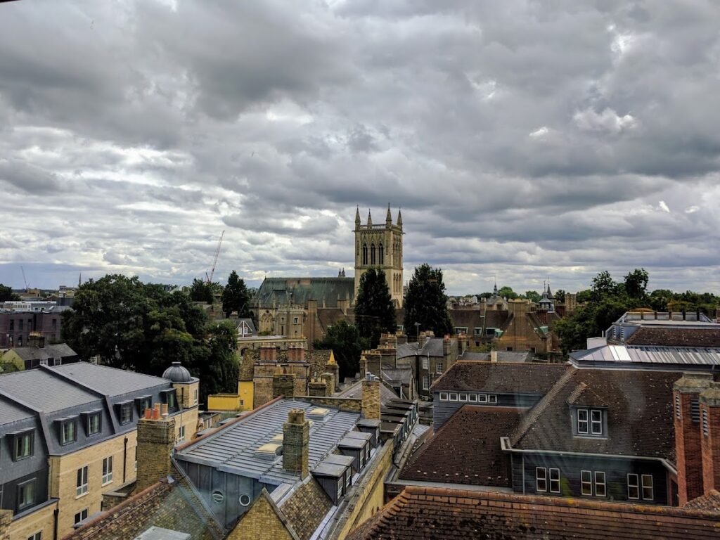This photo is taken from the top of the Varsity Hotel looking towards St John’s College. Read more about St John’s College and St Clement’s