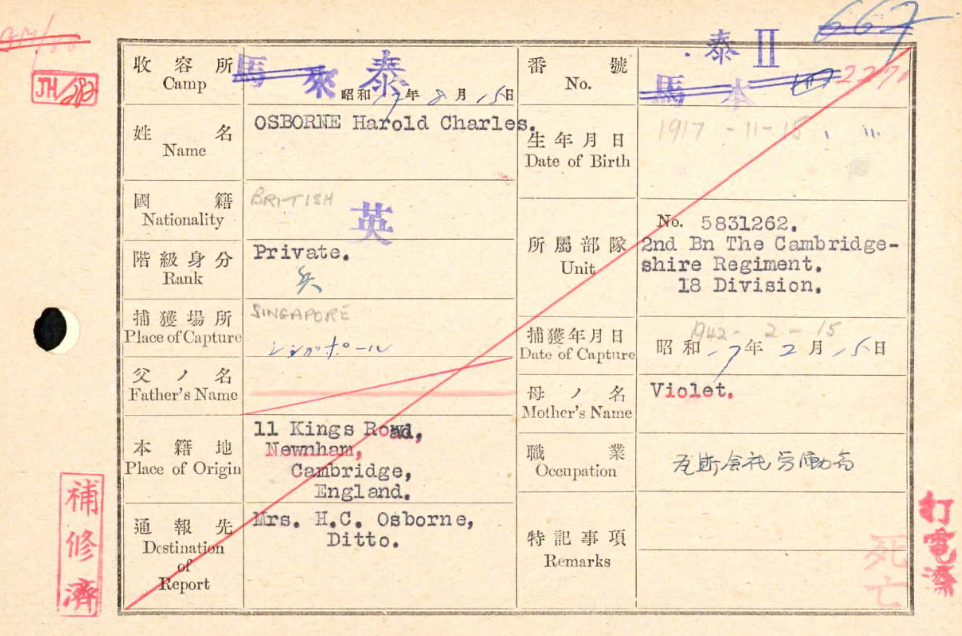 Harold Charles Osborn: Private 5831262 1st Battalion, The Cambridgeshire Regiment, Suffolk Regiment who was Lost at Sea on Thursday, 21st September 1944. Age 27. Son of Violet Osborn; husband of Gladys May Osborn, of Cambridge. Commemorated on SINGAPORE MEMORIAL, Singapore. Column 60.