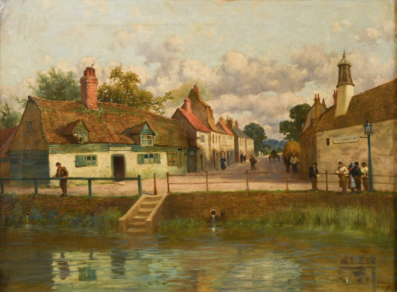 Newnham Mill Pool,c1900. Jolly Millers, left, brewery late The Malting House on right. Mott’s cows are fording the river.