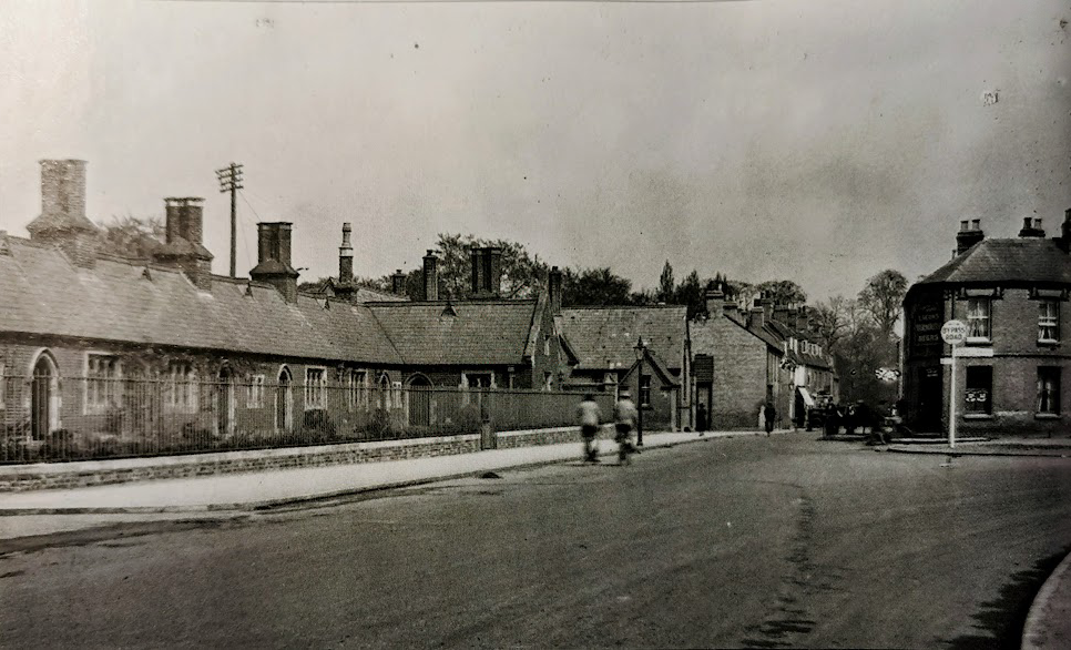 Perse almshouses, Newnham Road, 1920s (Cambridgeshire Collection)Dated on rainwaterheads 1861. Red brick with stone dressings. Single storey. Pointed Gothic 3-light windows with stone mullions. Panelled doors, drip moulds over with carved heads at either end. Slate roof with triangular vents; diagonally set chimneys, some double, some single