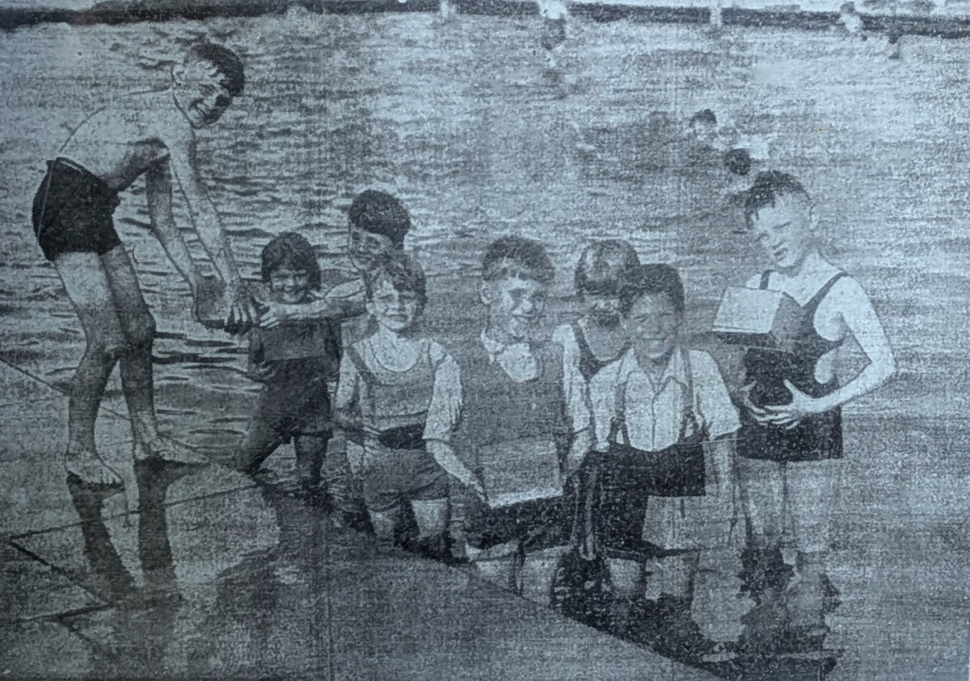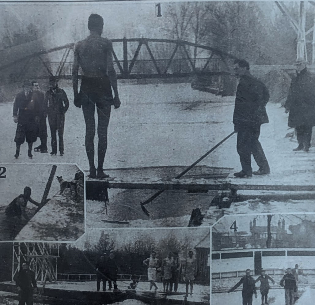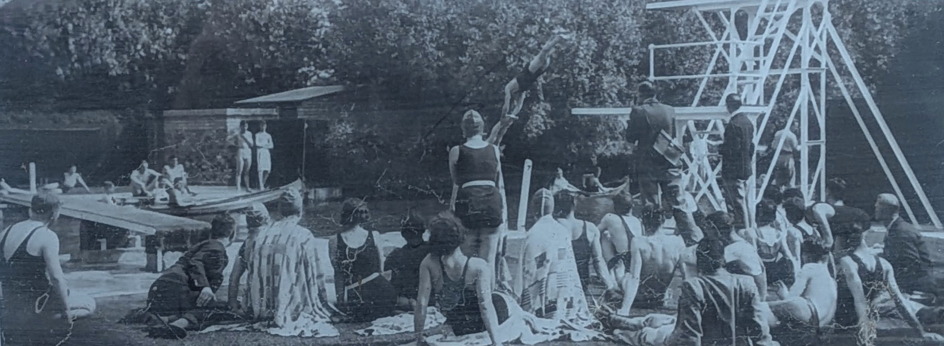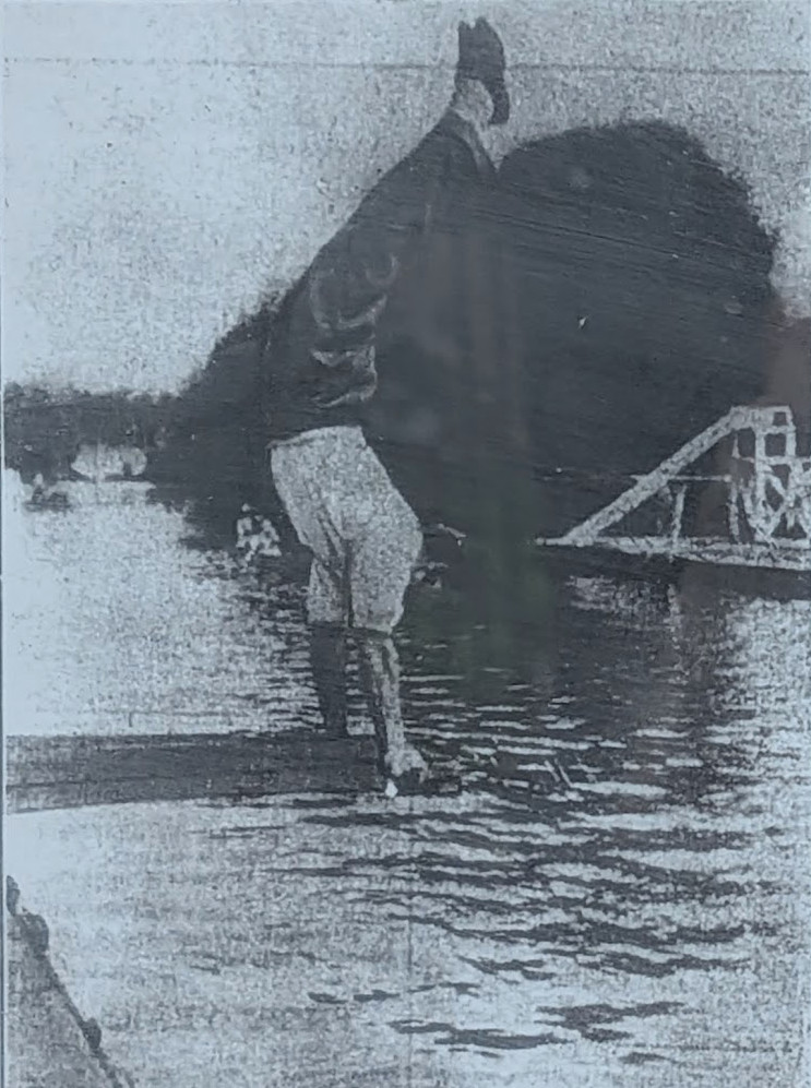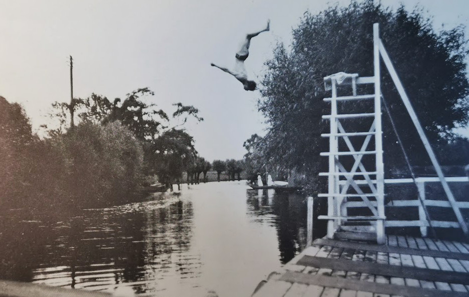 Stream on Sheeps' GreenCharley Driver diving at Sheep’s Green swimming station. Driver was custodian, life save and coach from 1903 to 1937. He was on duty dawn to dusk seven days a week and saved 90 lives. Jack Overhill also swam at this location every day for 62 years.