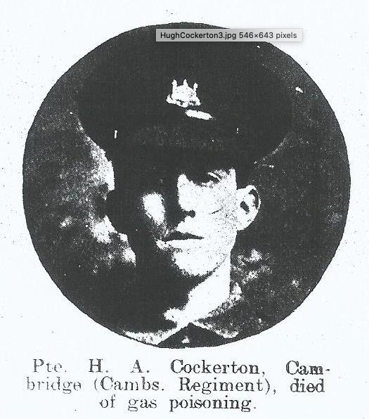 Hugh Aubrey Cockerton: Private 2991, 1/1st Battalion, Cambridgeshire Regiment. Died of wounds 2nd October 1916. Aged 17. Enlisted Cambridge. Son of the late John and Florence Holly Cockerton [5 Gothic Street] Buried in Doullens Communal Cemetery Extension No.1, Plot IV. Row F. Grave 15. See also Cambridge Guildhall and Cambridge St Mary the Less (St Paul’s Roll of Honour)