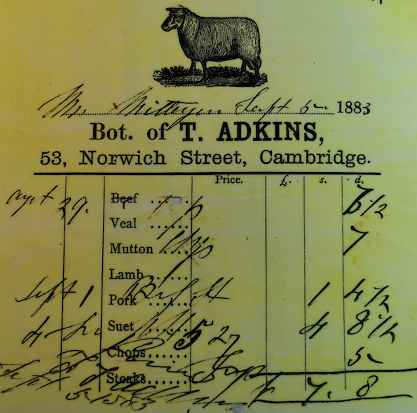 12/3/1909 Thomas Adkins of Musgrave Farm, Fen Ditton carried on a butcher’s business in Norwich Street for 30 years. He was well-known at the Cattle Market and was one of the judges at the Christmas Fat Stock sales. His death at the age of 61 came as a surprise, as he usually enjoyed excellent health. About a month ago, however, he broke a blood vessel and in spite of constant and skilful medical attention he died. (Cambridge Press)
