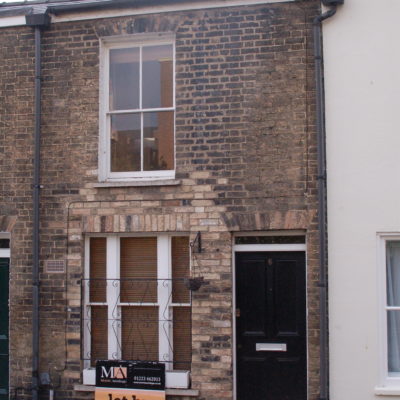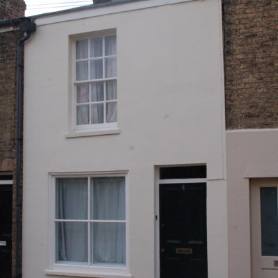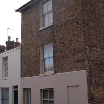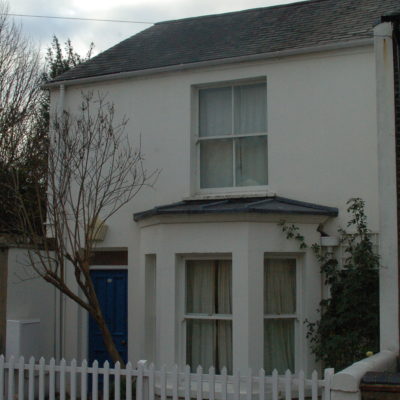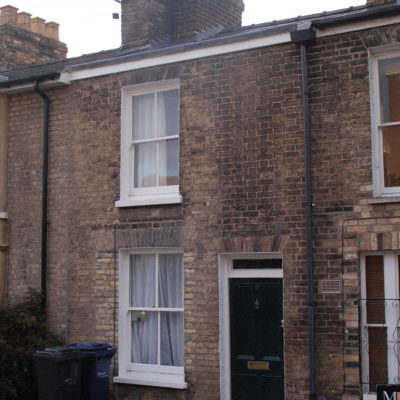 When you went in, the front room on the right was an office and the back right-hand room had two steps down to a brick floor. The room is still extremely cold. It had decayed shelves, traces of a heavy outside blind, and iron rings in the kitchen from which hooks could hang. Across the passage was the parlour, and behind it the kitchen. The neighbour at 44 said that the cold room had been a tiny dairy.