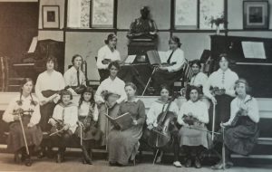 In the centre is the music teacher, Mis Evans. Mrs Hackforth who started the orchestra in 1919 declined to appear. Second from the left front row is Jean Robson. The setting is a temporary hall built in 1916.
