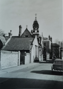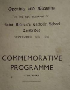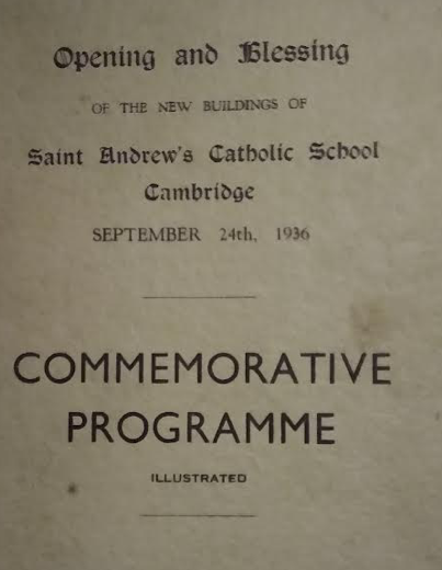 25/9/1936 The opening and blessing of the new Roman Catholic Schools and Hall at Union Road, Cambridge, presented a picturesque spectacle of stately ceremonial. In the morning Archbishop Goodier preached following a Pontifical High Mass in the Church of Our Lady when the glory of mauve and splendour of gold vestments stood out vividly among the black cassocks and white surplices. The new buildings were opened and blessed in the afternoon whilst the Roswitha Players from London gave the first stage show at the new Houghton Hall in the evening. (Cam. News)