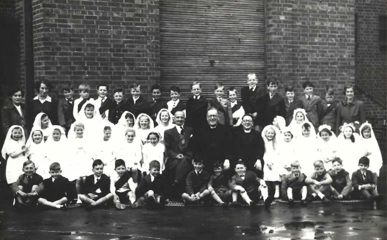 Mr Bates, headmaster, on left, Canon Stokes , middle, Father Oats, right. Margaret Cosgrove is seated next to Mr Bates. The Cosgroves lived at 56 Kendal Way.
