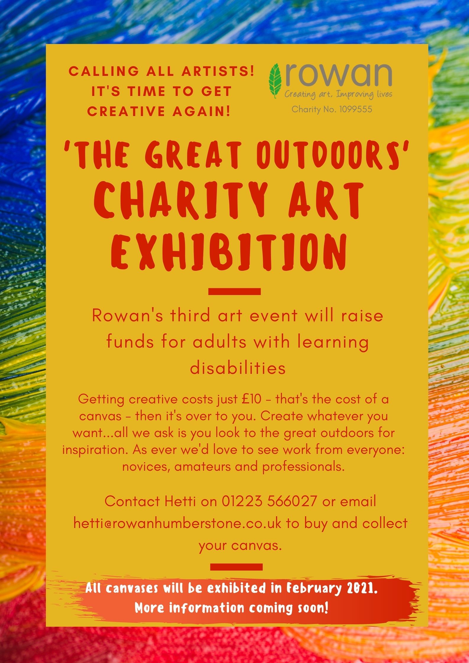We are holding our 3rd art exhibition to raise funds for our student artists as we continue to support them day-to-day at Rowan as well as virtually. At our last exhibition, held in February 2020, we had over 150 people involved with 172 canvases on display raising over £6000. We have decided to take the bull by the horns and go ahead with an exhibition for 2021 and we would love for you to be involved!