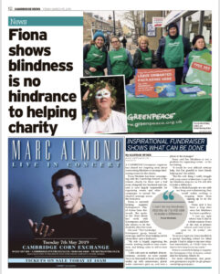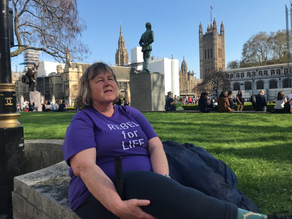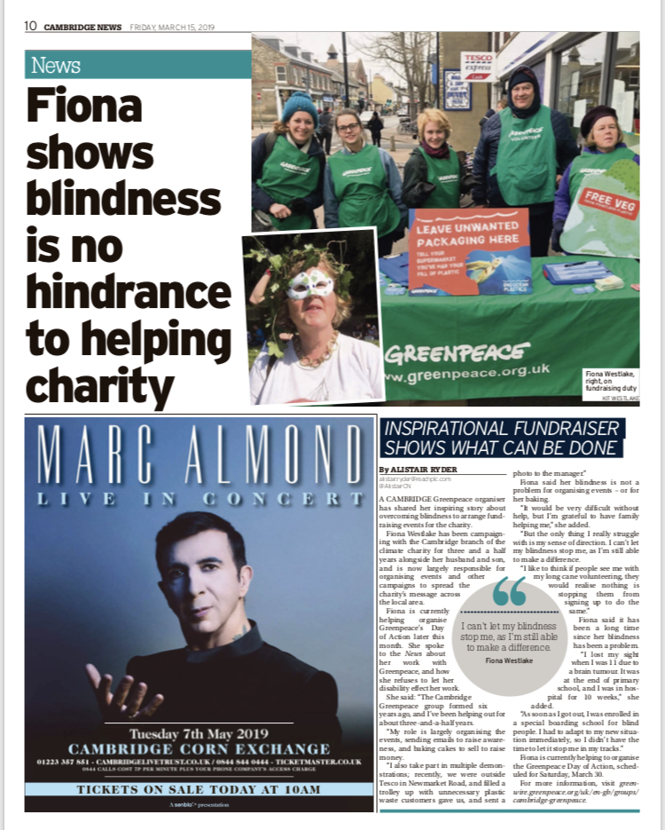 Fiona – who lost her sight when she was 11 – is also a member of Cambridge Extinction Rebellion since late 2018, which has included many roadblocks and a memorable night in Parliament Square locked on with a member of the Glasgow camp.