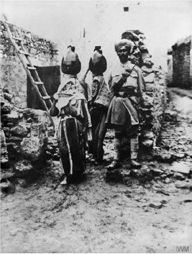 Two Palestinian women leaving a well which is guarded by an Indian soldier, November 1917.