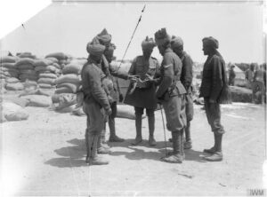 Troops of the 14th Sikhs of the 29th Indian Infantry Brigade examining a piece of shell from “Asiatic Annie” that fell in their camp.