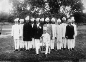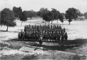 Recruits of the 2nd Lancers Cavalry Regiment with RisaldarMajor, an Indian senior officer (front).