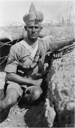 A Lance Naik (Lance Corporal) of the Indian 112th Infantry, 34th Brigade (17th Division), kneeling in a trench during the Battle of Sharqat, Mesopotamia 28-30 October 1918. Two days later the Turks surrendered and an armistice was declared.