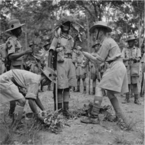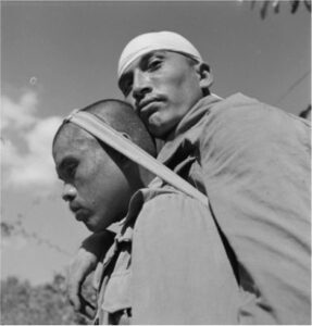 India 1944: A Gurkha soldier transporting a wounded man on his back through the jungle.