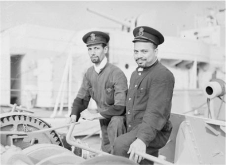 Twenty-three years with the Indian Navy.  Two men of the Royal Indian Navy whose service  totals 46 years;  Abbas Tajuddin , Chief Stoker (left) and Yusuf Ali Chief Mechanic. Thet are both from Ratnigari, and have both served in the Royal Indian Navy for 23 years. They are at present serving in the Indian Sloop Kristna.