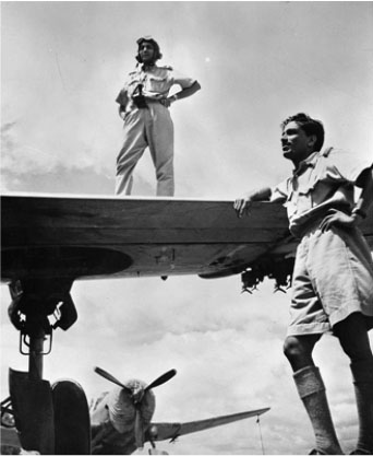 Two Indian Air Force pilots (Flight Lieutenant Lal and Flying Officer M M Sakhre) pose with their Vultee Vengeance dive bombers at an airfield in Assam, India, from where they attacked the Japanese in Burma.
