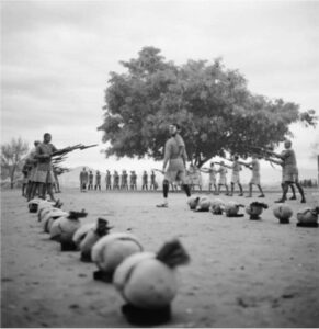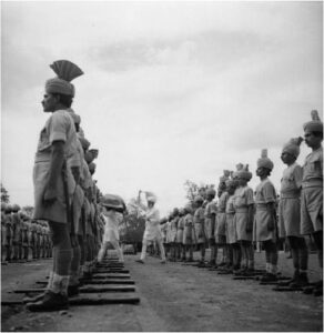 Sikh recruits at bayonet practice at a Frontier Constabulary Training Post. Their puggarees (turbans) are lined up in the foreground.