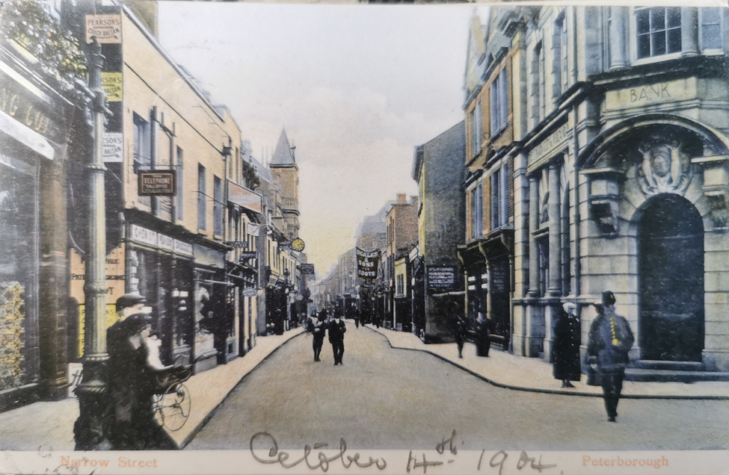 Narrow (Bridge) Street, Peterborough, from Market SquareAt one point Narrow Street was only 15 feet across. Most of the buildings here had been demolished by the late 20th centry but the coat of arms over the bank is still recognisable today.