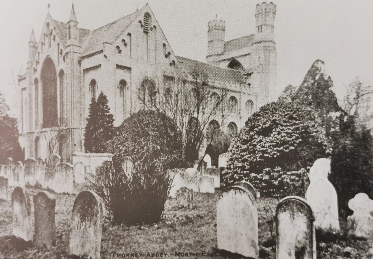 View from Thorney Abbey, 1967 (MoC101/68)Parish church formed from the 5 west bays of the nave of the Abbey church. A monastery was founded circa 670 destroyed in Danish raid of 870 and refounded in 972 for Benedictine monks. In circa 1085 church was rebuilt by Abbot Guenther and completed circa 1108. The 5 bays of the nave of the church is all that remains, the east end, aisles, and almost all the monastic buildings have gone. In 1638 the ruined church was restored as parish church, when the aisles were demolished and the arcades were filled in with Perpendicular windows.