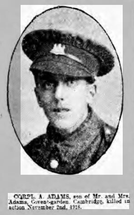 Corporal A Adams, killed in action November 2nd 1918. Corporal A Adams served with the Lincolnshire regiment and before the war had worked at Eaden Lilley.