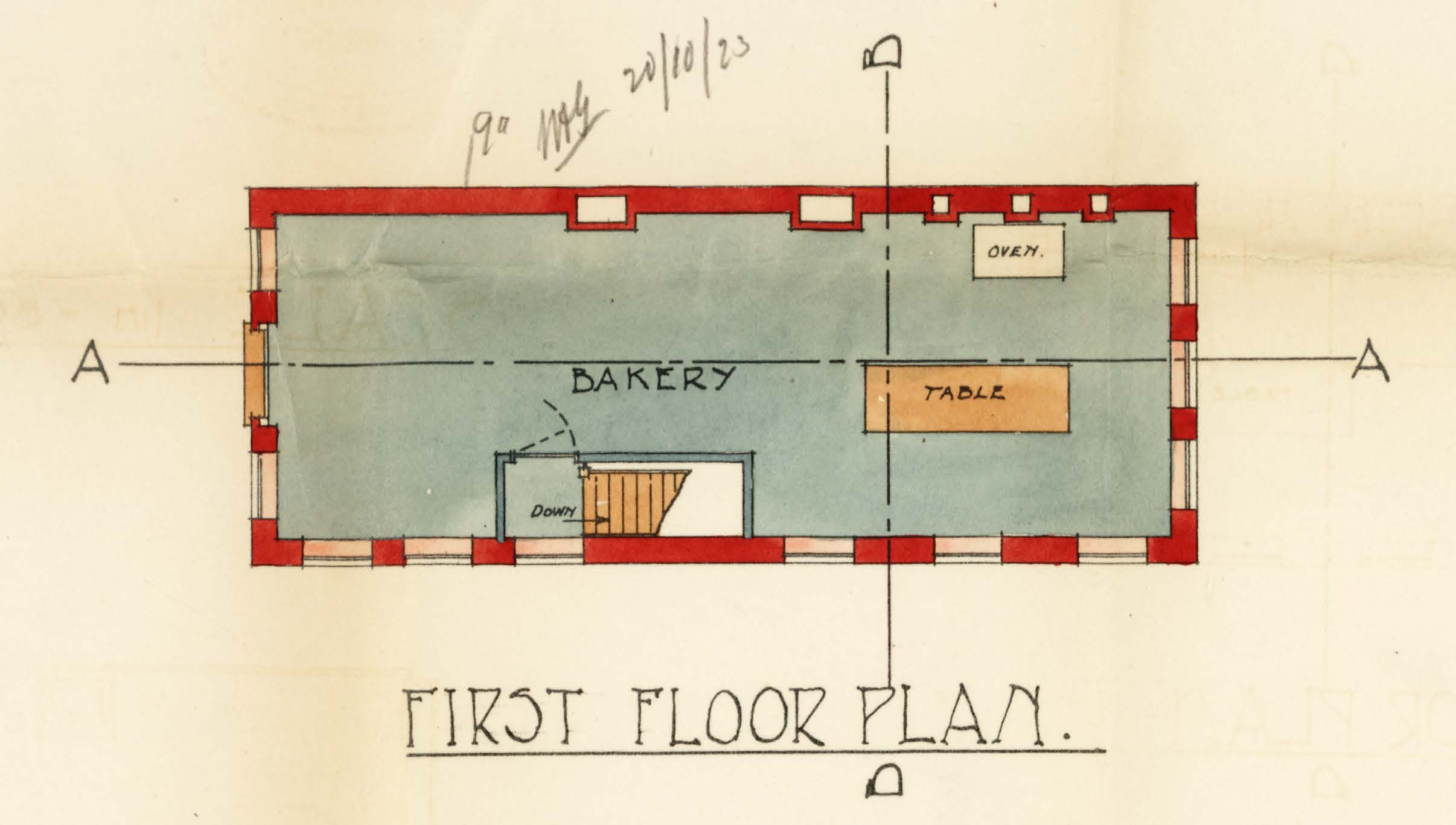 The first floor was a bakery with oven, where the pastry cases for pork pies and puff pastry for sausage rolls were made. On the first-floor frontage was a pair of narrow doors (now the tall window) through which the finished products could be winched down to a van for delivery to the branches and to customers. The basement was probably a fuel store. The architect was George P. Banyard of 30 Sidney Street.