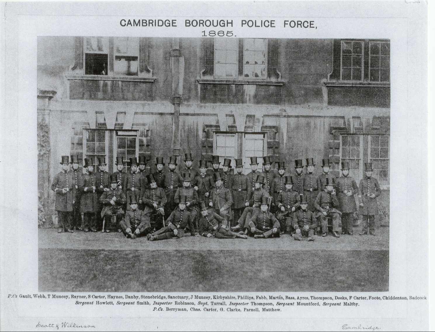 Edward Kirbyshire is pictured in the centre of the back row (11th from left) in this photograph of the Cambridge Borough Police Force taken in 1856.