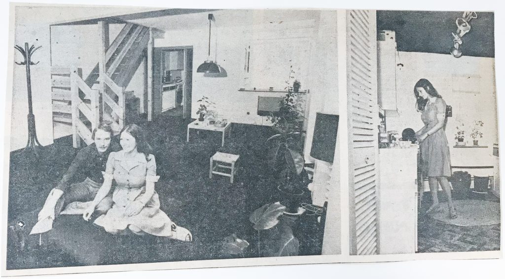 In this same space – 23 feet by 16 – just a year ago were two small living rooms, and a steep staircase leading up from a narrow entrance hall. Now open plan pine stairs lead straight out of the room. The transformation has not been achieved by spending large sums of money. It is far more due to the sheer hard work of the young couple who bought the house, knowing nothing about building or any of the skills involved. Norman Jarrold, a hairdresser, and his fiancee, Wendy, bought the house last summer, decided what they wanted to do and had the plans accepted three months later. After that came an enormously hard grind both working every evening on Sundays – Norman is busy hairdressing on Saturdays – during the six months until the couple married at Easter…