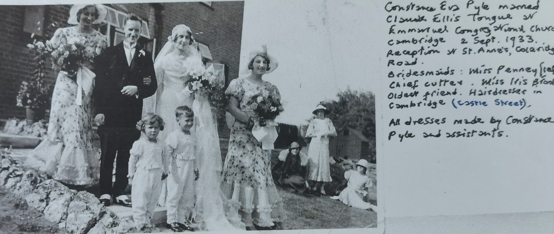 They married at Emmanuel Congregational church Cambridge 2 September 1933. The reception was at St Anne’s Coleridge Road. The bridesmaid, from left were Miss Penney, chief cutter, and Miss Iris Brooks, a hairdresser in Castle Street. All the dresses were made by Constance Pyle and assistants.