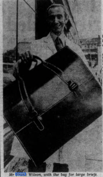 As the photograph above shows, there are briefcases and briefcases. The case is a special order conceived, designed and executed by master craftsman Mr Frank Wilson of Norfolk Street, Cambridge for a London barrister. It’s home eventually will be the Old Bailey, holding the briefs for and against the famous and infamous of that renowned courthouse. The order was placed two years ago. Four cow hides have been used to make it. Mr Wilson has hand-stitched it all. His work on the case will soon be finished and the result of his labour insured … for £600.