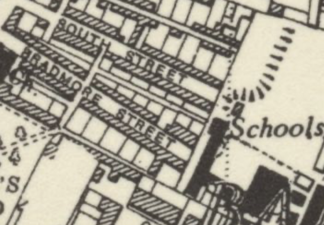 1950 OS map of South Street and Bradmore Street: the photo above was taken from black college building next to the capital S of ‘Schools” looking west down back alley between South and Bradmore Streets.