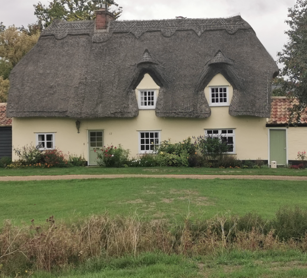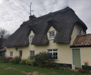 Cottage. Late C17. Timber framed, plaster rendered and long straw thatch, half hipped roof with rebuilt ridge stack of red brick.