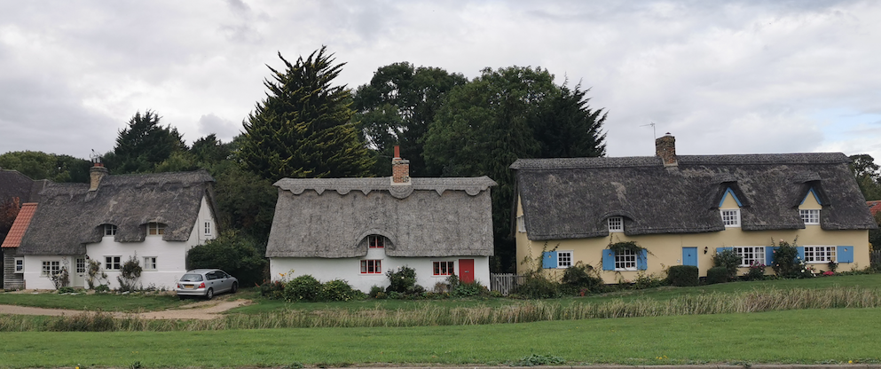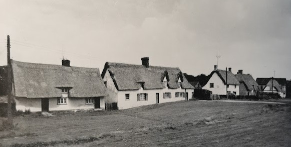 Pair of cottages, now one. C18. Timber framed plaster rendered and long straw thatch with shared red brick stack of two flues.