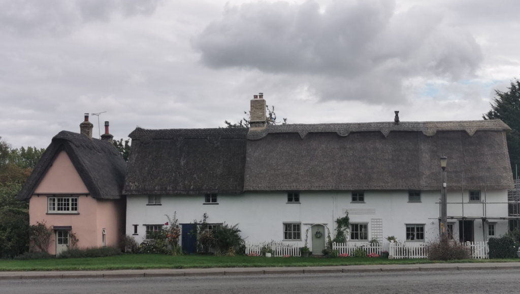 Cottage. Late C18 and early C19. Timber framed, rendered and long straw thatch.