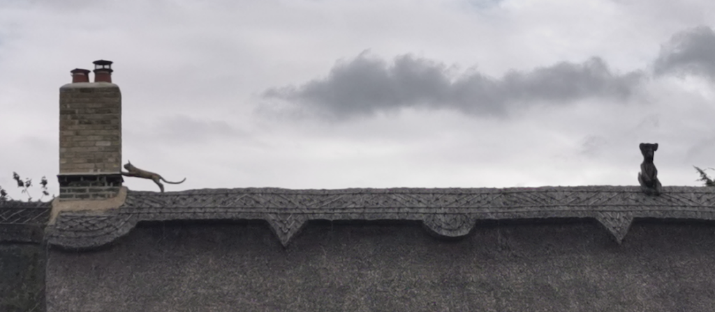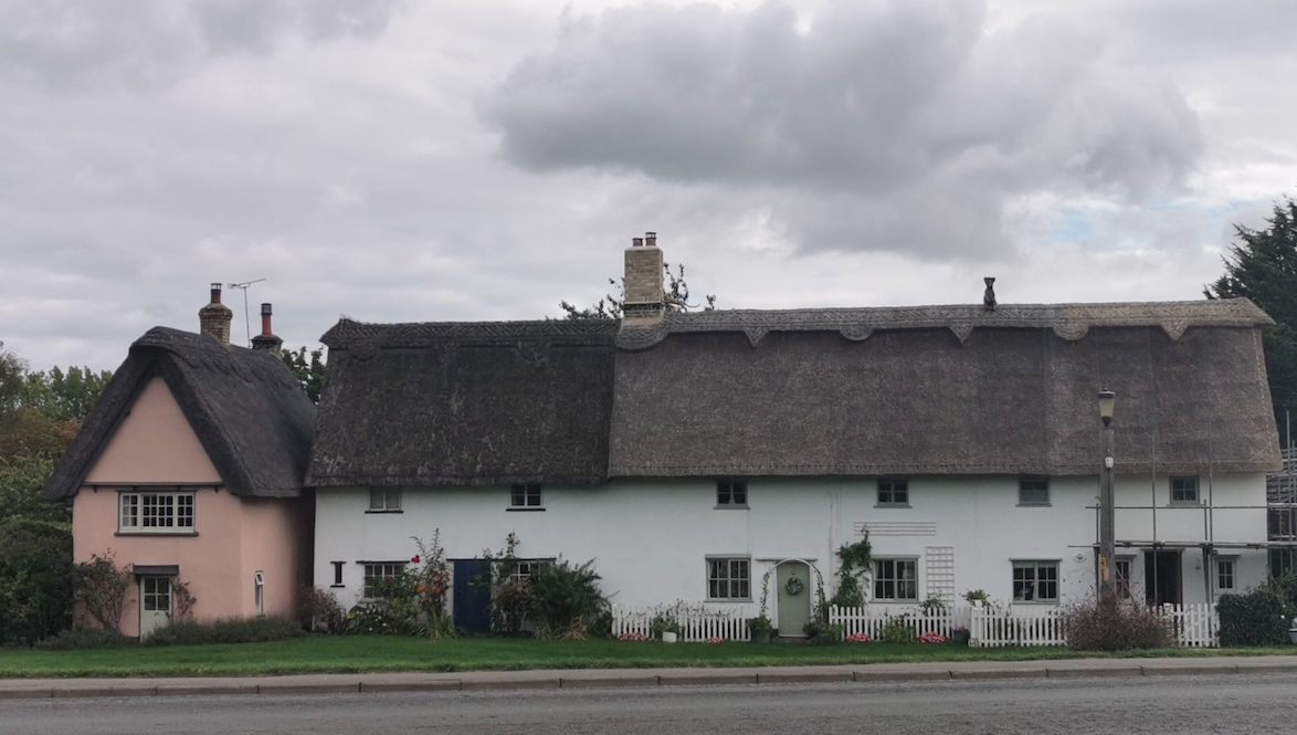 Pair of cottages. Early C19. Timber framed plaster rendered and long straw thatch with grey brick, shared ridge stack
