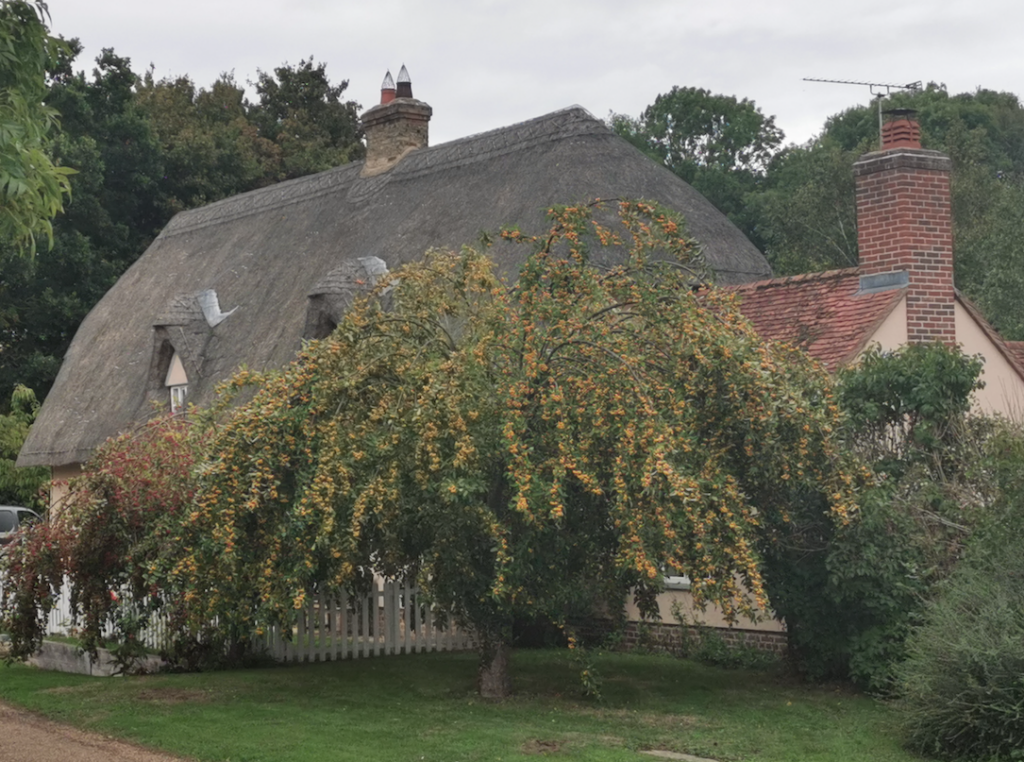 Cottage. Late C17. Timber framed, roughcast rendered and long straw thatch, half hipped roof with ridge stack. Lobby entry and three bay plan.